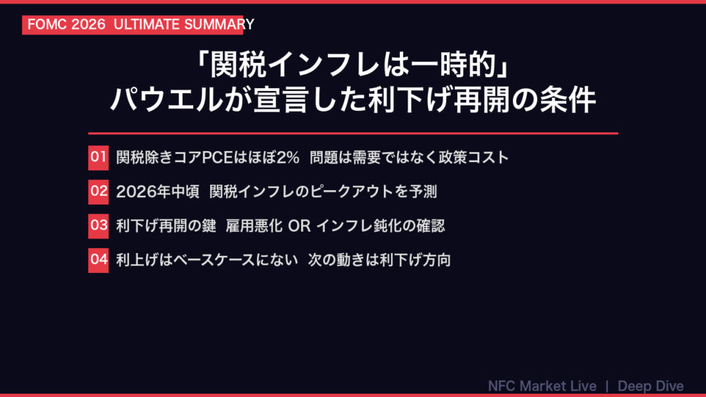 本記事は「NFC Market Live」の自動解析システムによって最速で作成されたマクロ経済レポートです。(Update: 2026-03-16 14:07) 📺 動画で詳細な解説を見る 最大のサプライズ:「関税インフレは一時的」宣言と利下げ再開の条件 今回のFOMC会見で最も重要... -