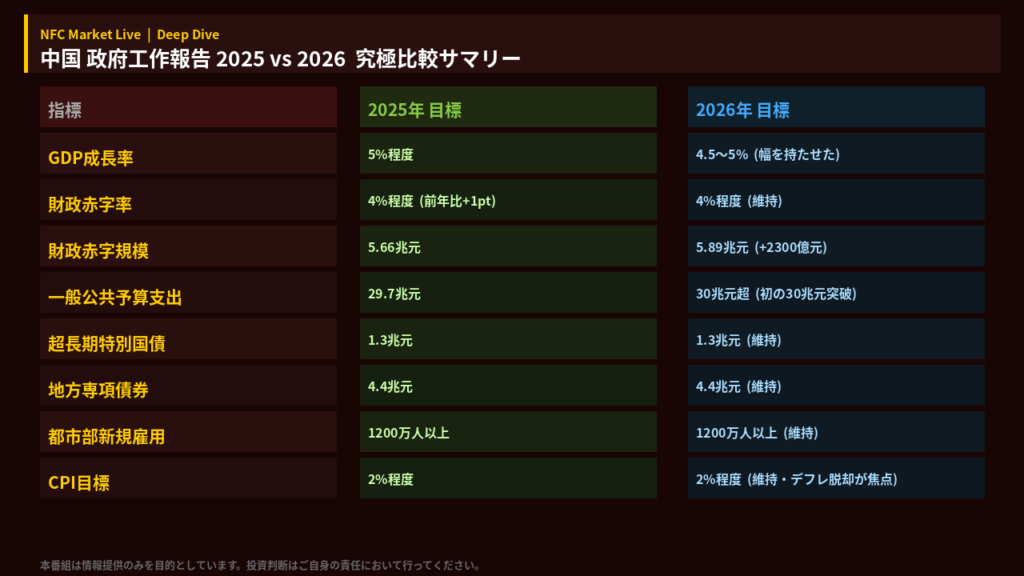 本記事は「NFC Market Live」の自動解析システムによって最速で作成されたマクロ経済レポートです。(Update: 2026-03-14 17:37) 📺 動画で詳細な解説を見る 究極の比較サマリー 最新のレポート分析です。中国全人代で発表された2025年と2026年の政府工作... -