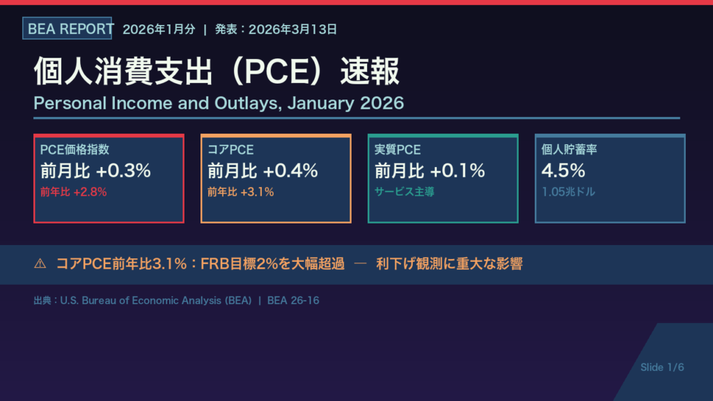 本記事は「NFC Market Live」の自動解析システムによって最速で作成されたマクロ経済レポートです。(Update: 2026-03-13 21:49) 📺 動画で詳細な解説を見る 速報:1月PCE概要 皆さん、こんにちは。本日は2026年3月13日に米国商務省経済分析局、BEAが発表... -