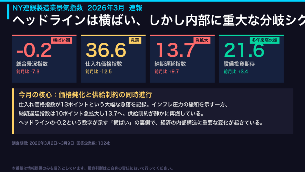 本記事は「NFC Market Live」の自動解析システムによって最速で作成されたマクロ経済レポートです。(Update: 2026-03-16 22:57) 📺 動画で詳細な解説を見る 3月の決定的シグナル 最新のNY連銀製造業景気指数、2026年3月のレポートを分析します。ヘッドラ... -