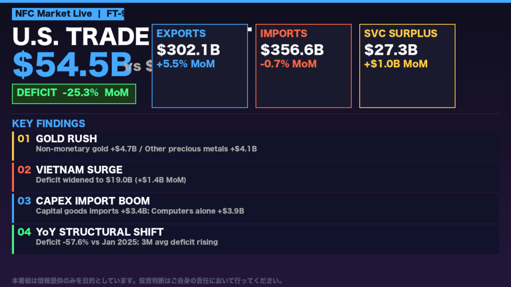本記事は「NFC Market Live」の自動解析システムによって最速で作成されたマクロ経済レポートです。(Update: 2026-03-12 22:34) 📺 動画で詳細な解説を見る スライド 1 の解説 最新の米国・貿易収支の分析です。2026年1月の米国の財・サービス貿易赤字は... -
